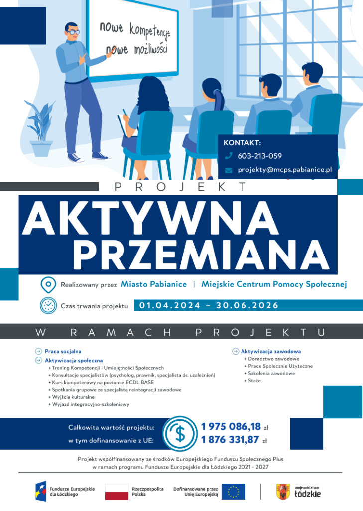 W projekcie „Aktywna przemiana” od 03.02.2025 ruszyła II edycja kolejnej grupy osób. Zostali objęci wsparciem pracownika socjalnego przez podpisanie kontaktów socjalnych. Przed nimi intensywne 3,5 miesiąca działań. Udział w edycji rozpoczęli od podjęcia prac społecznie użytecznych w podmiotach wskazanych przez instruktora reintegracji zawodowej (po stworzeniu Indywidualnego Planu Działania), kolejne etapy to szkolenia miękkie, spotkania ze specjalistami (wg kalendarza i potrzeb), szkolenie komputerowe ECDL, a także wyjście kulturalne na spektakl „Wyjście awaryjne”. Od pierwszego dnia uczestnictwa w projekcie, wszystkie osoby mają zapewniony ciepły posiłek oraz są w trakcie załatwiania formalności potrzebnych do wyrobienia migawki kwartalnej.